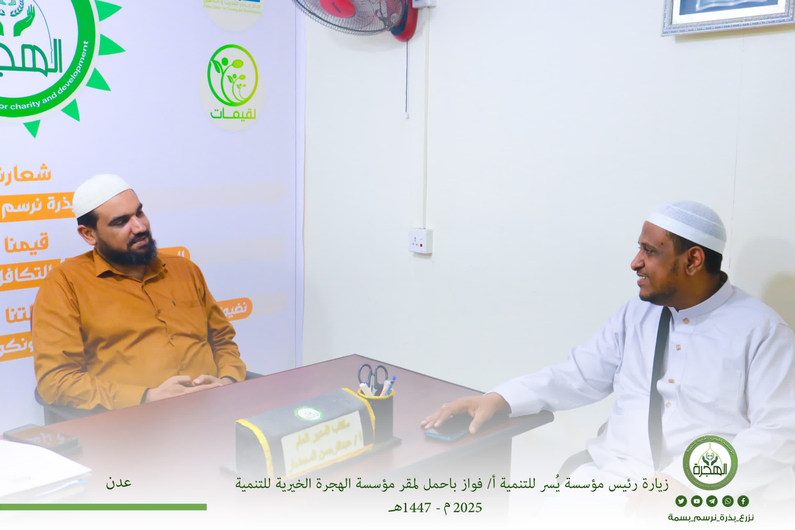 وفي اللقاء تم التباحث عن المشاريع القادمة المشتركة بين مؤسسة الهجرة ومؤسستي الإكتفاء ويسر لإنشاء شراكة دائمة بينهما في المجال التعليمي والتنموي والإغاثي .